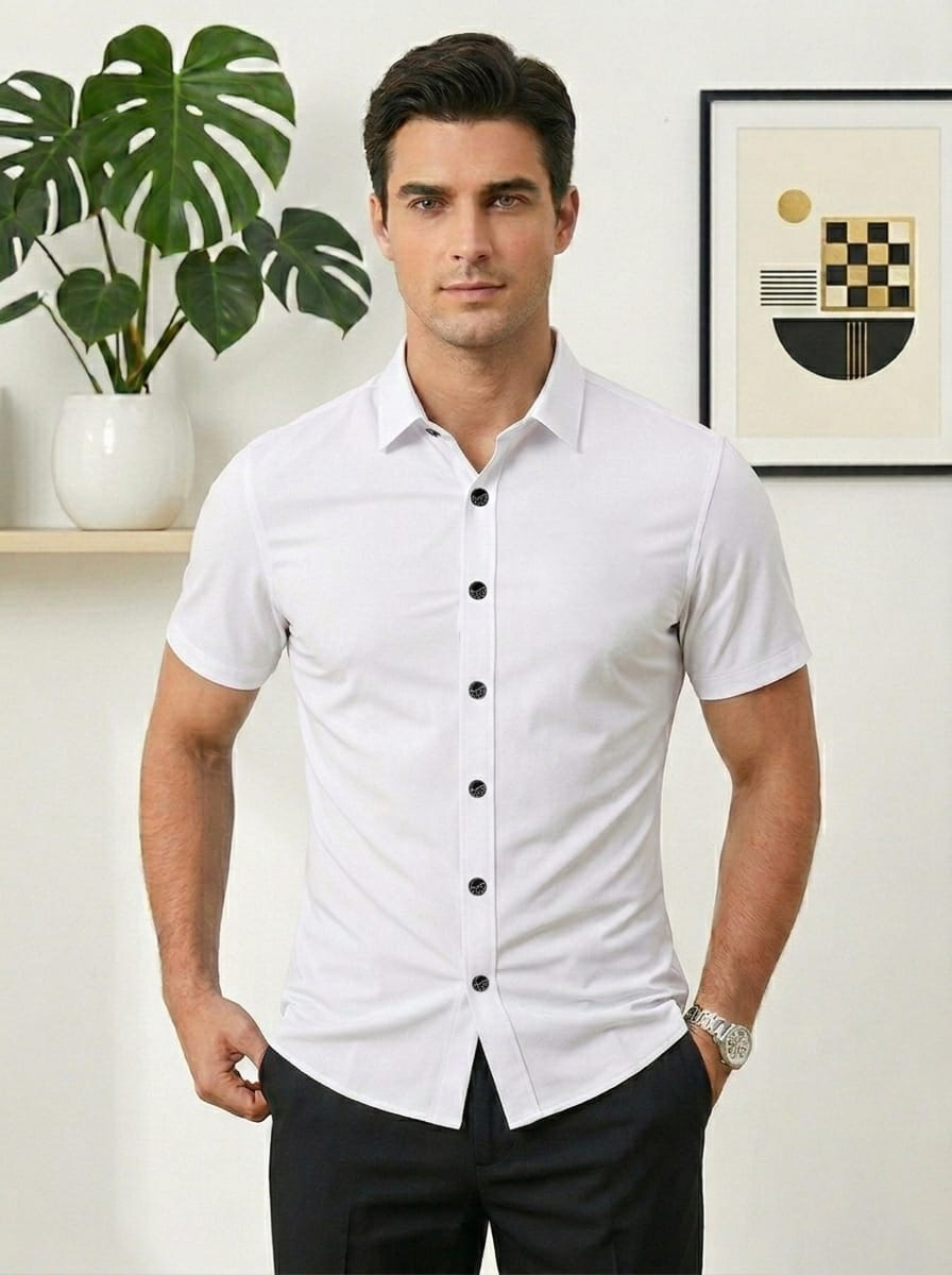 The lightweight and breathable material makes it perfect for casual outings, office wear, dinner events, and special occasions. Its clean button-down front and structured collar give a polished appearance while the stretch fabric ensures easy movement and a perfect fit.