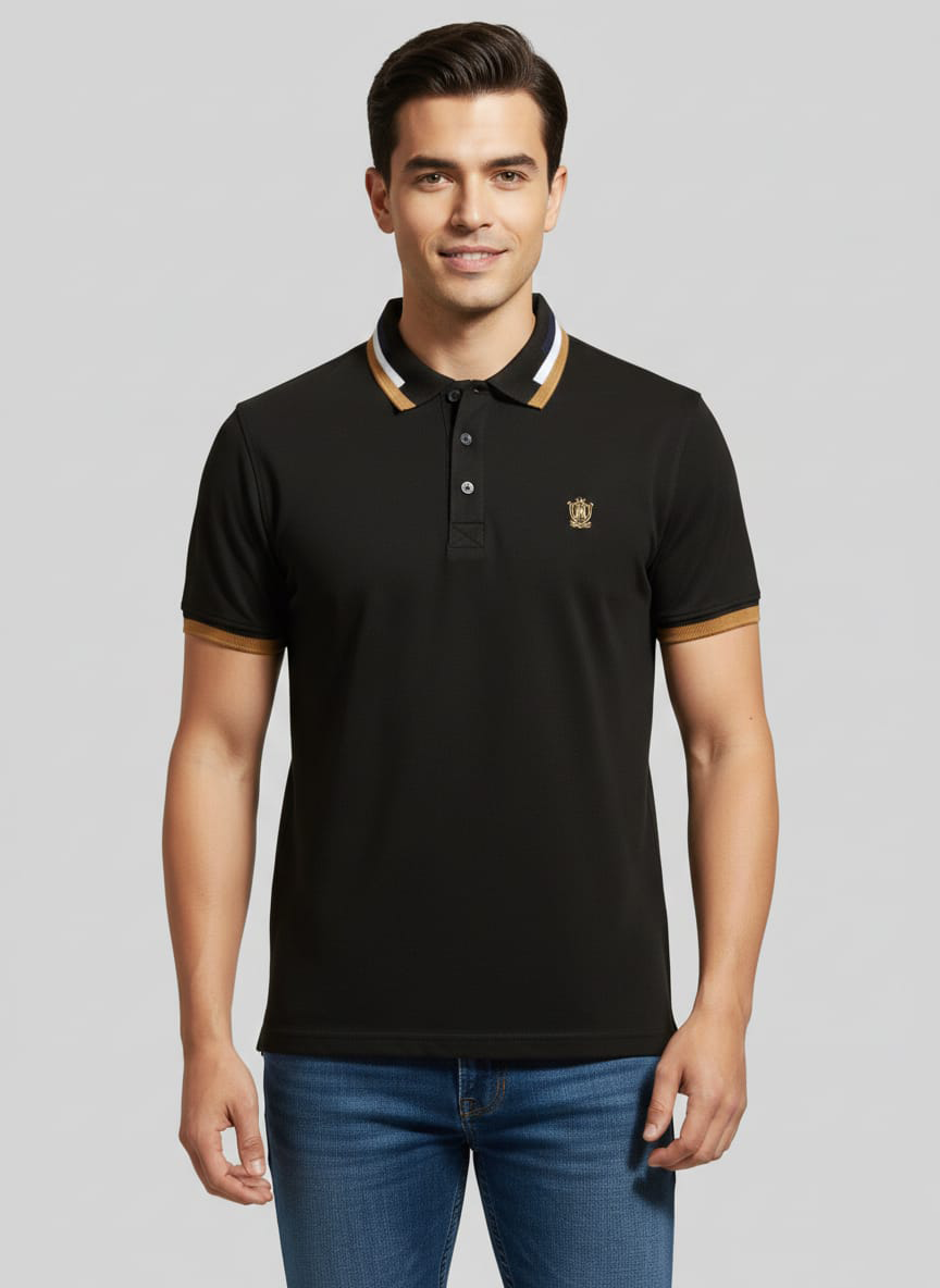 This premium polo T-shirt is crafted for those who value elegance, comfort, and timeless design. Made from high-quality, breathable fabric, it delivers a smooth feel and a structured fit that holds its shape throughout the day. The refined trim detailing on the collar and sleeves adds a subtle luxury touch, while the embroidered crest logo enhances its premium identity. Designed to be versatile and stylish, this polo T-shirt is suitable for a wide range of occasions, from everyday casual wear to polished smart-casual looks, making it an essential addition to any modern wardrobe.